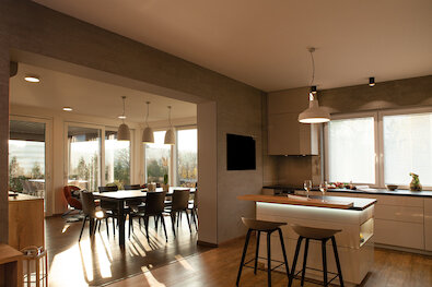 Původní dispozice domu neumožňovala řešení dle přání majitelů, a tak se autorka projektu rozhodla pro zasklení terasy sousedící s obývacím pokojem, rozšíření stavebního otvoru a propojení prostoru, který tak získal zcela novou dimenzi. Z bývalé terasy vznikla samostatná jídelna s relaxačním koutkem, aby vysněná kuchyně splňovala všechny požadavky.