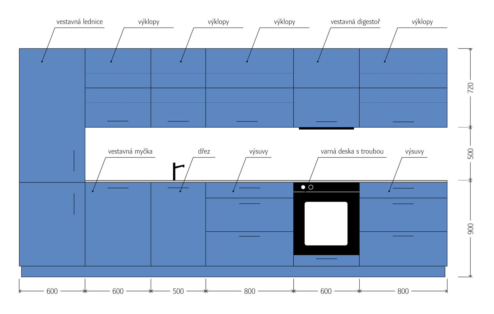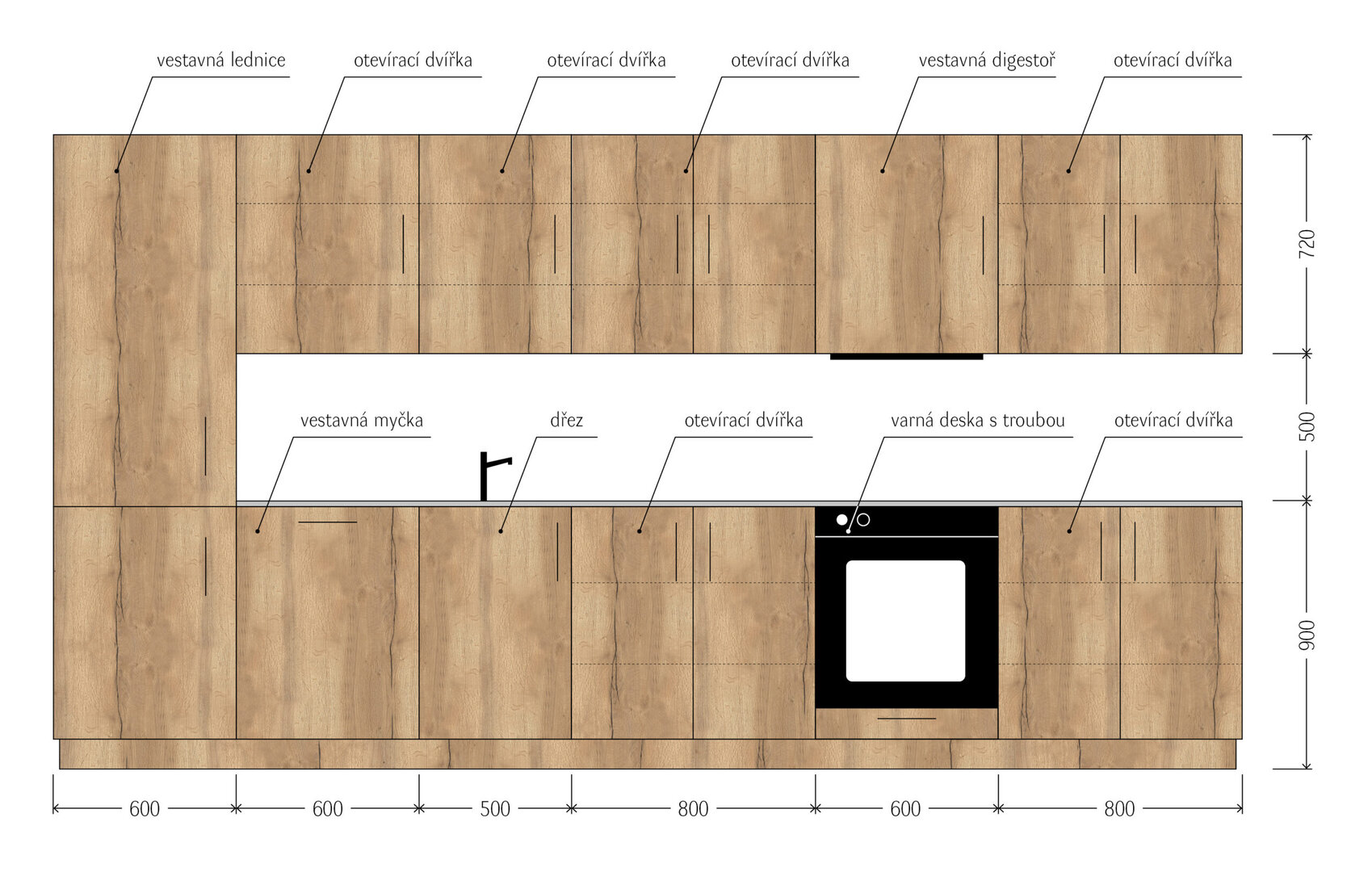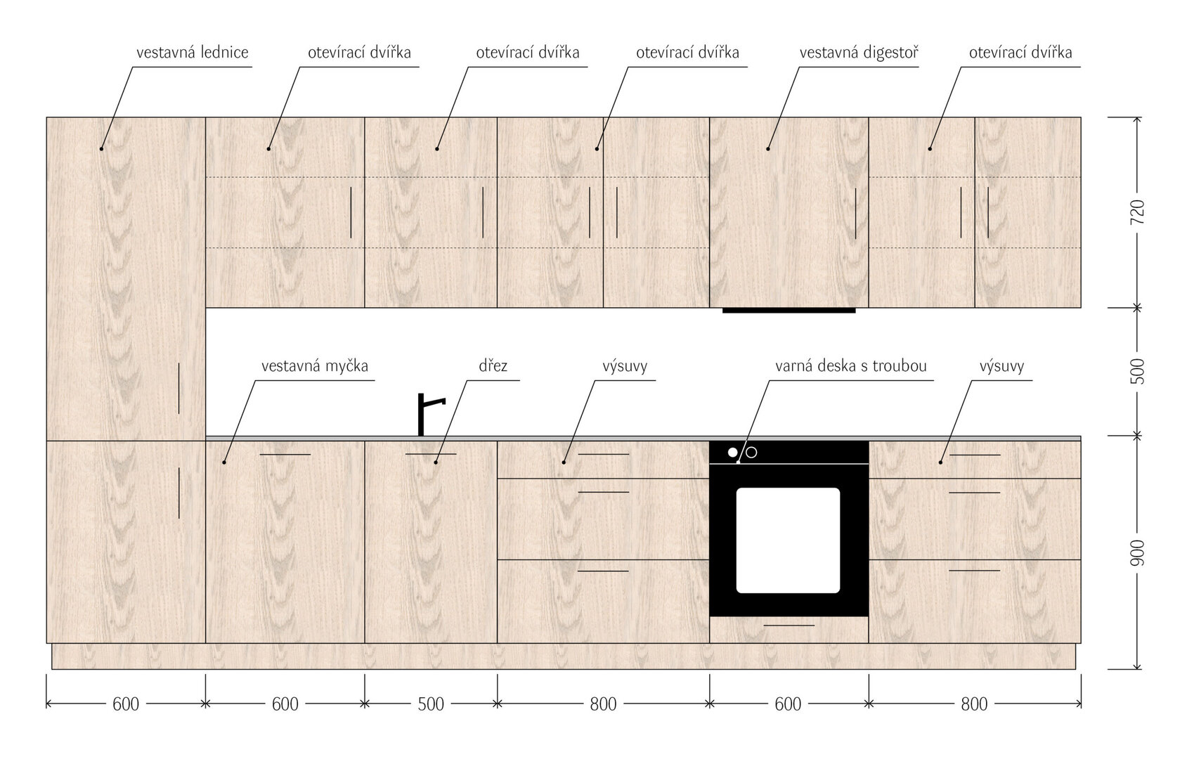 V tomto návrhu počítáme se solidní jednoduchou policovou kuchyní s kvalitním kováním a laminovanou dřevotřískovou (LTD) deskou. V kalkulaci je zahrnutá kuchyňská linka o délce 3,9 metru. Spodní i vrchní skříňky mají police a otevírací dvířka vyrobená z LTD.