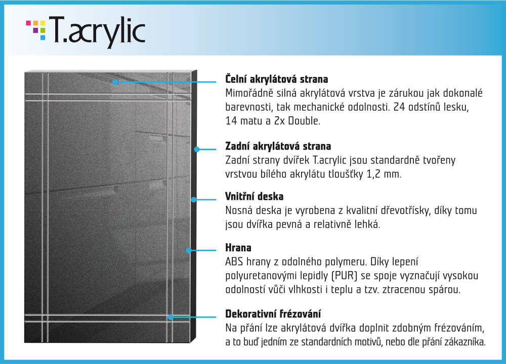 Základem konstrukce dvířek T.acrylic je DTD (dřevotřísková deska), lehký a pevný materiál. Čelní plocha nesoucí akrylátovou vrstvu (PMMI) je silná 1,4 mm. Tloušťka vrstvy a kvalita akrylátu přispívají k dokonalé barevnosti a hladkosti povrchu. Zadní strana dvířek je vyrobena z tvrzeného polystyrenu a má stejný barevný odstín jako strana čelní. Spoj čelní plochy a hrany dvířek je téměř neviditelný. Hovoříme o „ztracené spáře“, která vzniká jako výsledek lepení polyureatnovým lepidlem.